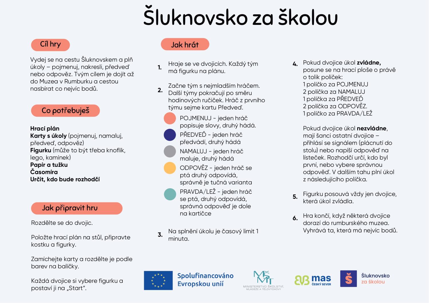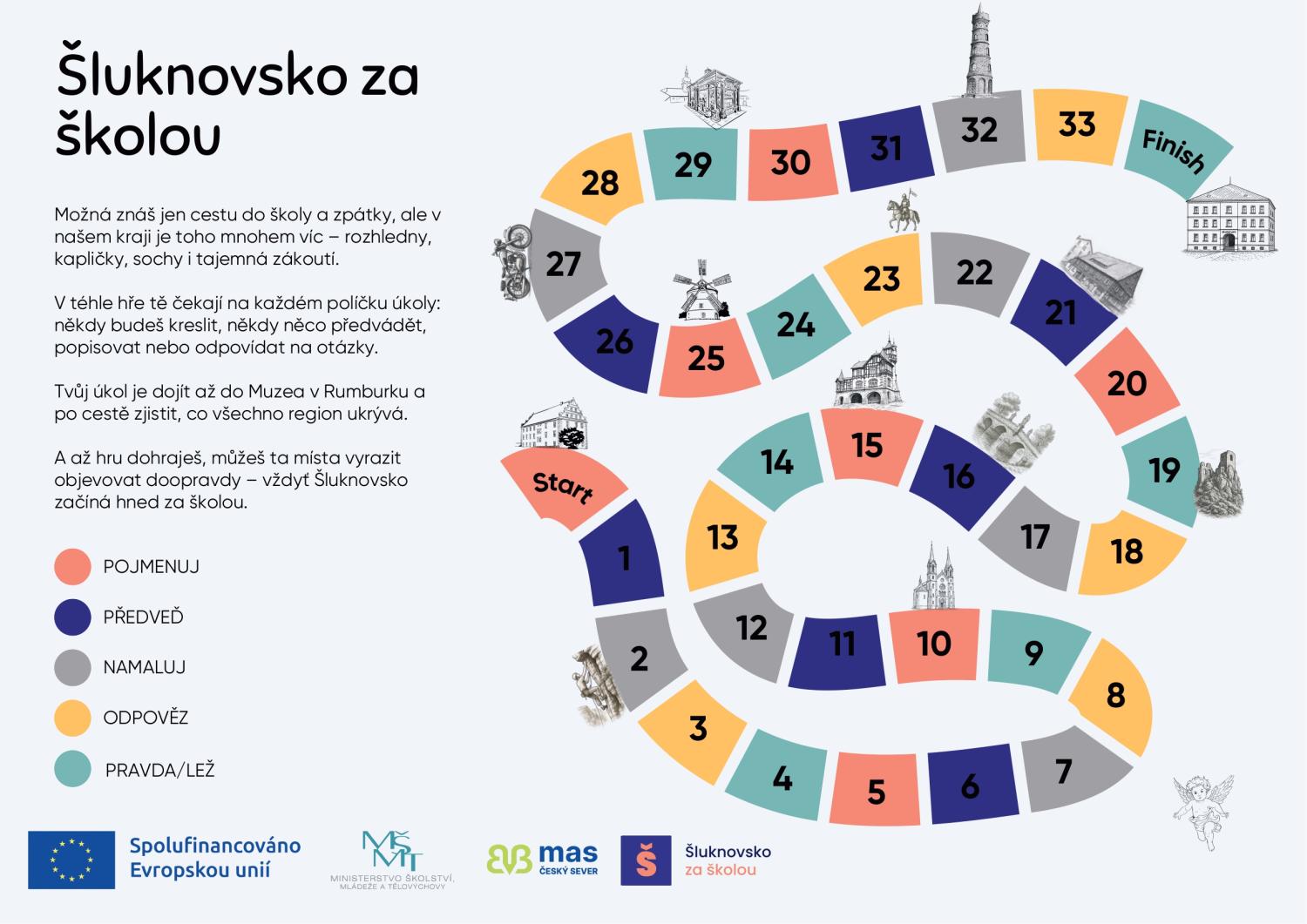 Hráči se na hracím plánu vydávají ze Startu až do Muzea v Rumburku. Po cestě plní různé typy aktivit — kreslení, popisování, pantomimu i vědomostní otázky. Každý úkol pracuje s tématy, která mohou děti znát z našeho webu.