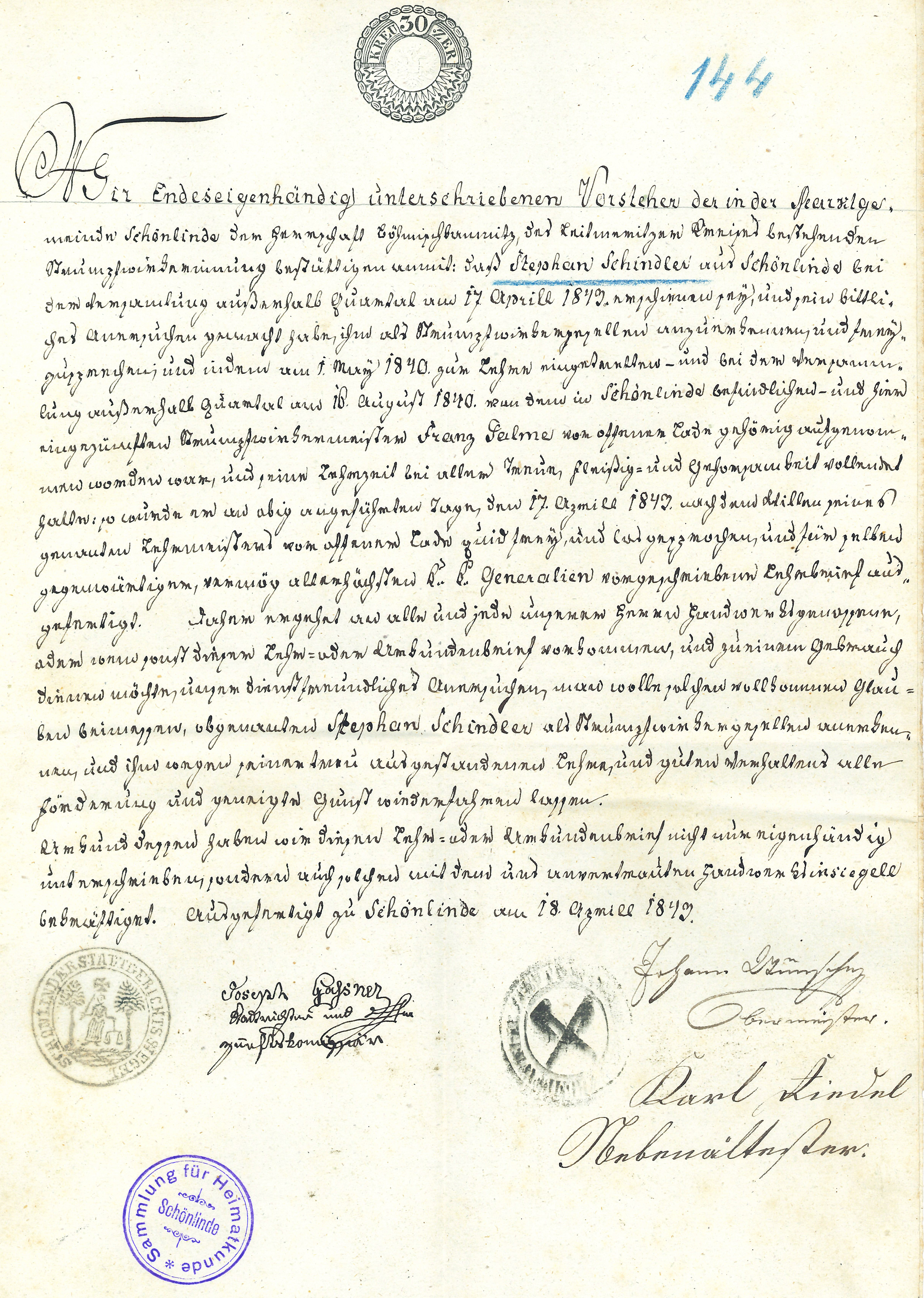 Stefan Schindler se stal pletařským tovaryšem po tříletém učení v pletařské dílně u mistra Franze Palmeho. Představitelé místního cechu mu vydali výuční list 17. dubna 1843. Jeho vysoce formalizované znění v českém překladu si můžete přečíst zde: