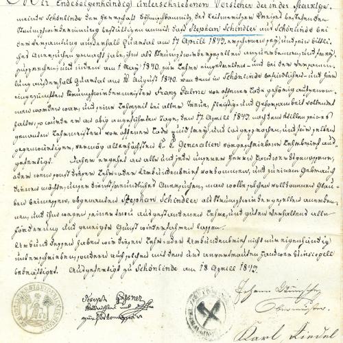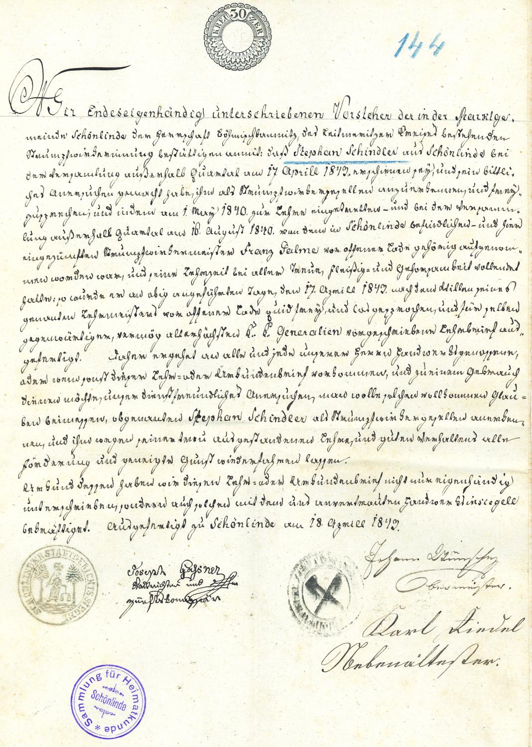 že Stefan Schindler z Krásné Lípy se dne 17. dubna 1843 dostavil na mimořádnou cechovní schůzi a předložil svou poníženou žádost, aby byl uznán a propuštěn jako punčochářský tovaryš a jelikož dne 1. května 1840 vstoupil do učení a při mimořádné schůzi dne 16. srpna 1840 byl punčochářským mistrem Franzem Palmem, v Krásné Lípě usazeným a cechovně zapsaným, před otevřenou cechovní truhlou řádně přijat do učení, a svou učednickou dobu dokončil s veškerou věrností, pilností a poslušností, proto byl téhož dne, 17. dubna 1843, podle vůle svého mistra opět před otevřenou cechovní truhlou propuštěn z učednického stavu a uznán jako tovaryš, a byl mu vystaven tento výuční list podle nejvyšších c. k. předpisů.